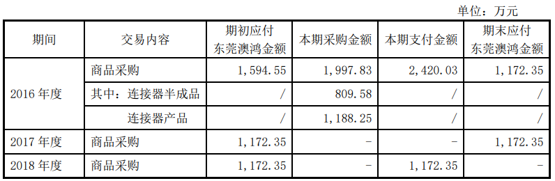 报告期内,东莞澳鸿与发行人不存在关联交易。捷皇有限2018年度向东莞澳鸿支付货款1,172.35万元系支付的报告期之前向东莞澳鸿采购连接器半成品、连接器产品剩余未支付完毕的货款,具体情况如下: