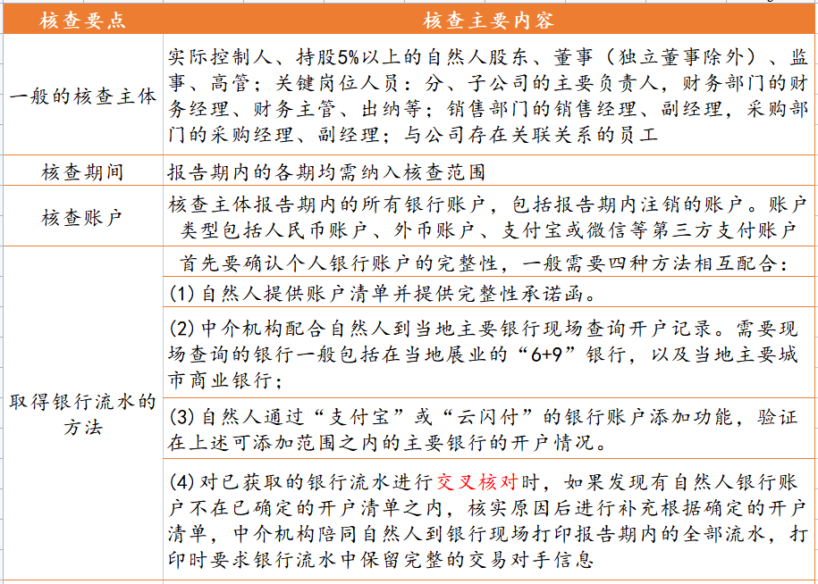 关联企业的主体一般限定为实际控制人能够控制的主体,其核查期间、核查账户、取得流水的方式、核查标准和核查方式与IPO公司内部银行流水核查基本一致。